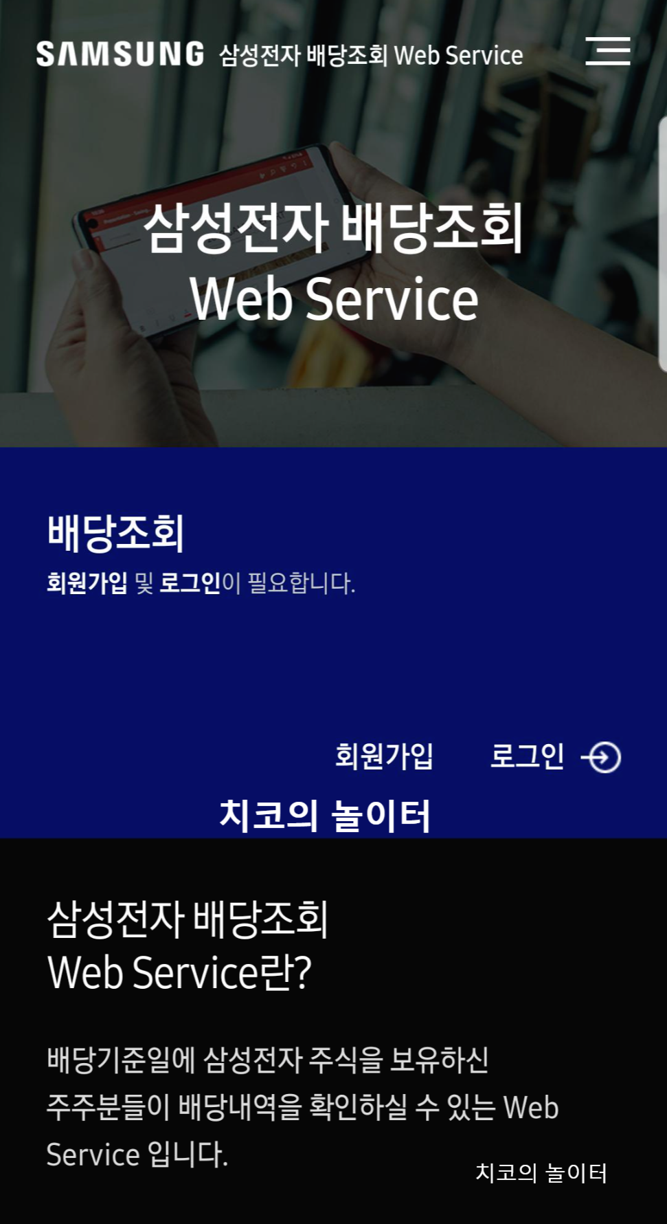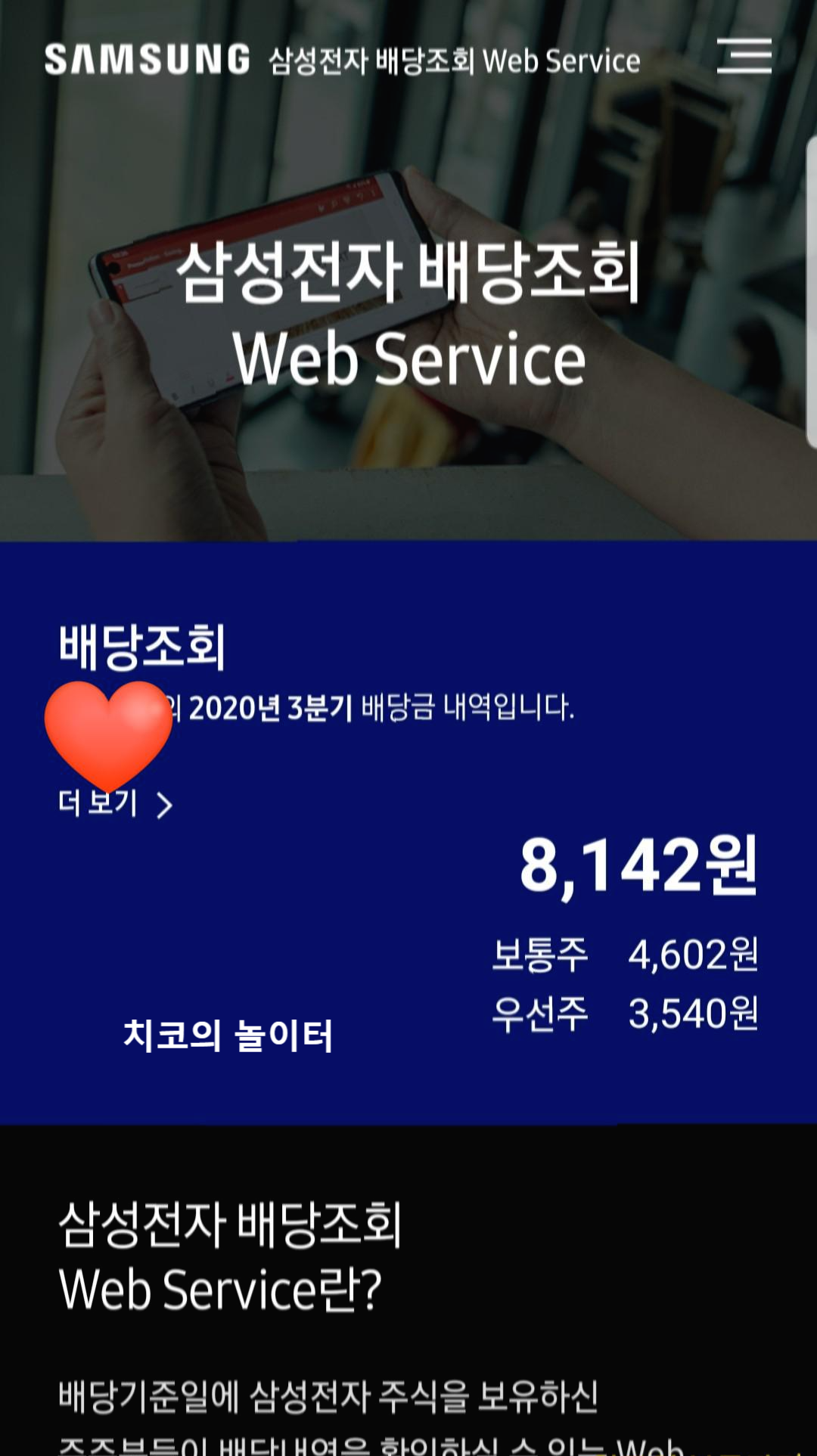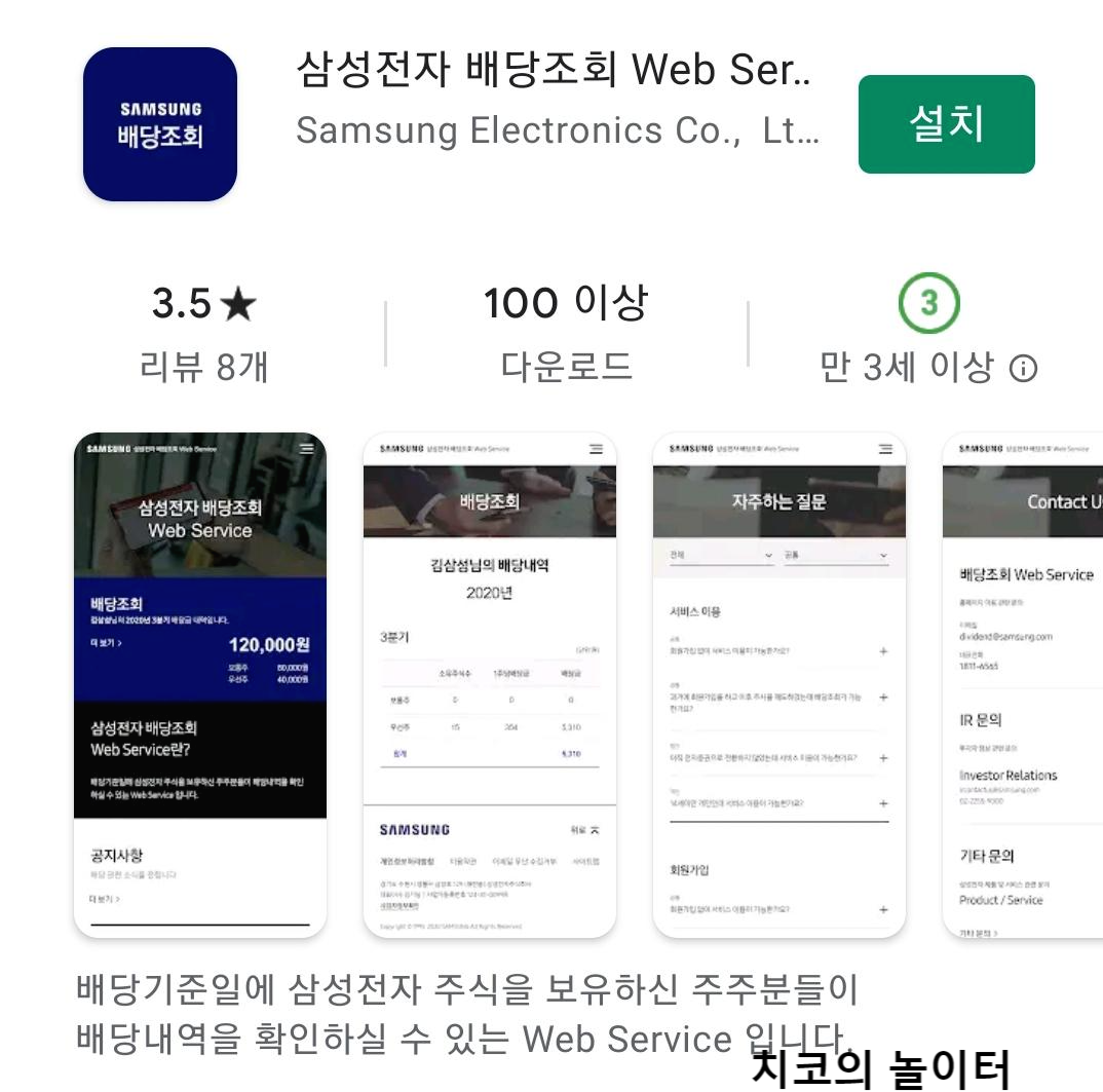 3분기 배당 시기가 다가왔다. 매 분기 배당금을 지급하는 애정 하는 삼성전자 보통주, 우선주 주식이다. 초보 주린이는 아직 소액의 주식만을 투자 중이지만 꾸준히 자산을 사서 모아갈 생각이다. 삼성전자는 3분기부터 웹에서 배당을 조회할 수 있다. 간단히 모바일에서 삼성전자 배당 조회 앱을 설치해서 확인해 본다.