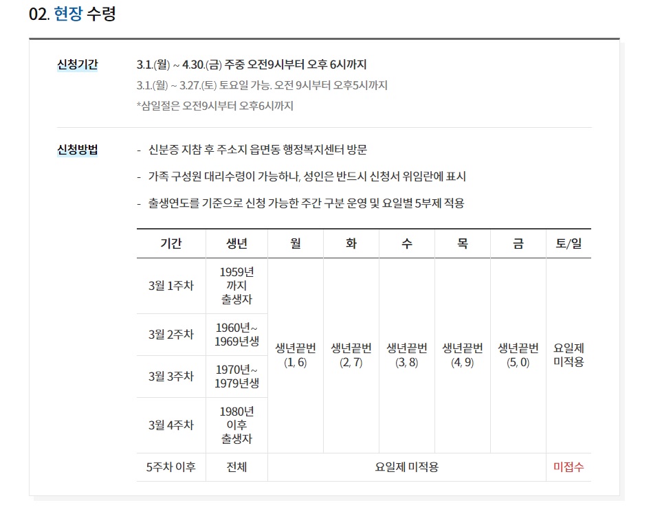 공적 마스크 살 때처럼 생년 끝자리로 신청 날짜가 다르다.
