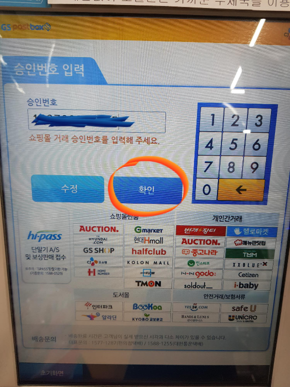 승인번호 입력 후 주문자님과 판매자인 저의 정보, 그리고 택배상품정보를 확인 후 예를 누릅니다.