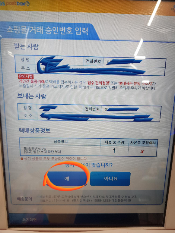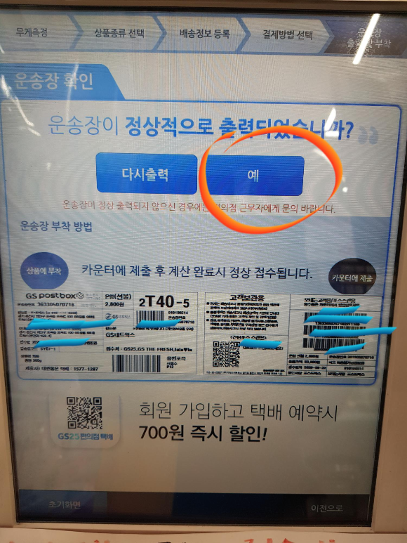 택배 보내는 기기 위에서 운송장이 출력되네요. 정상적으로 출력되었으면 예 누릅니다.