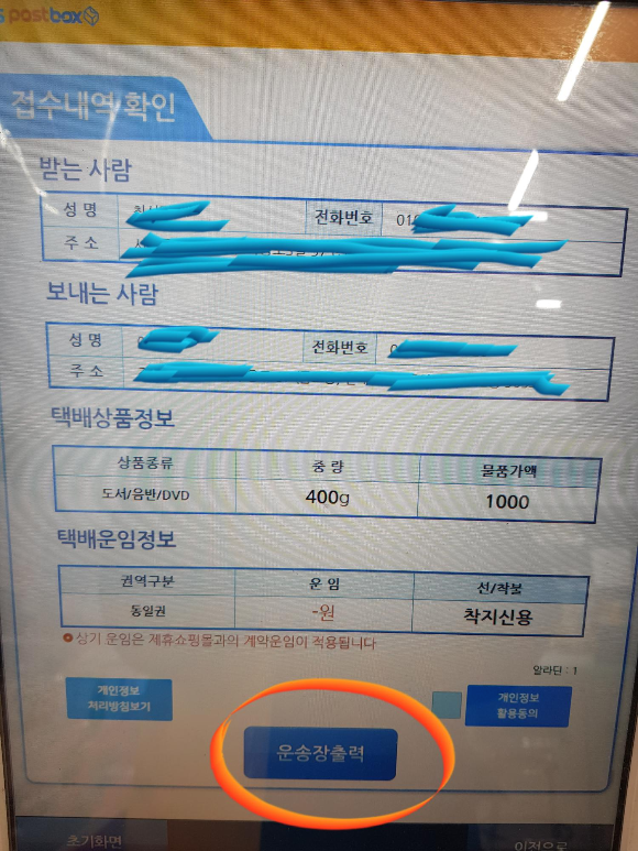 무게측정까지 마친 후 접수내역을 다시 확인하고 아래 개인정보 활용 동의까지 체크했습니다. 사진은 체크한 걸 안 찍었나 봐요. 이제 다 끝났네요. 마지막 운송장을 출력합니다.