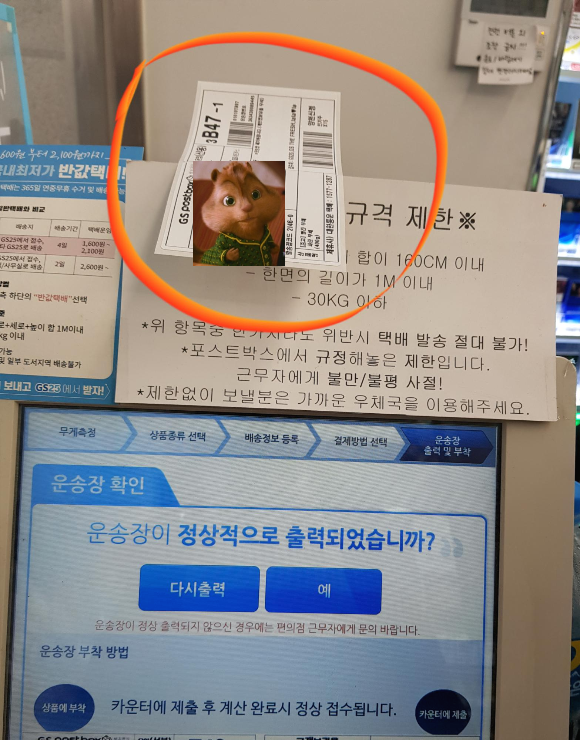 카운터에서 바코드 인식을 마친 후 이제 좌측에 있는 운송장을 보낼 택배에 붙입니다.