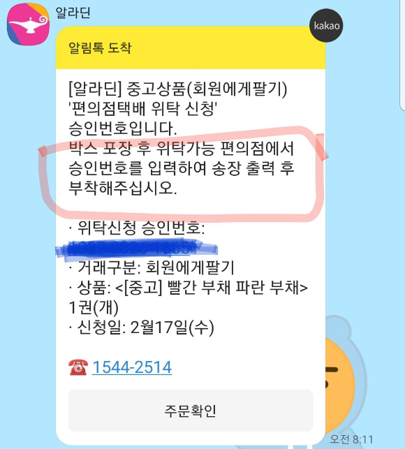제가 알라딘 지정 편의점 신청을 했더니 이렇게 알라딘 카카오톡 알림톡이 오네요. 열일하는 카카오^^