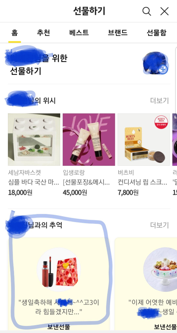 저는 생일이나 기념일 챙길 때 주로 카카오톡 선물하기를 이용하고 있습니다.