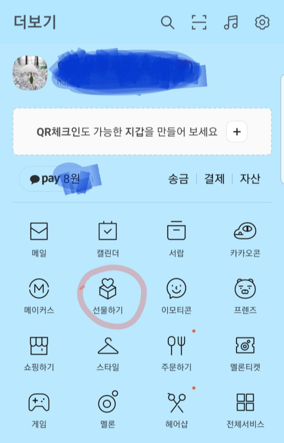 중간쯤 선물하기 보이시죠? 카카오톡 선물하기에 들어갑니다.