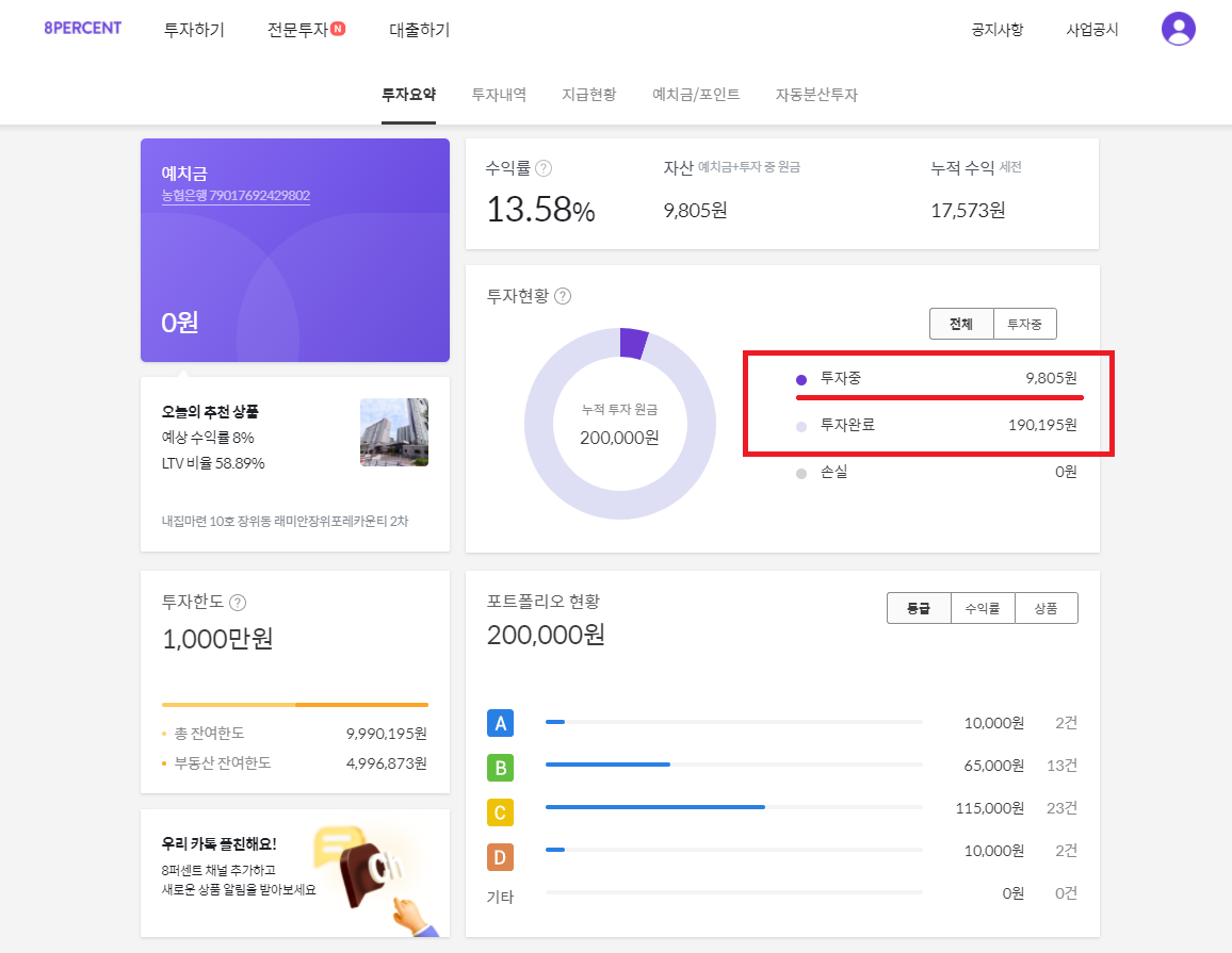 현재 투자금 20만 원 중 상환된 금액은 190,195원이고 현재 투자 중인 건 9,805원, 투자수익률은 13.58%이네요.