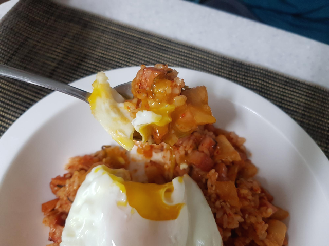 마지막으로 계란 프라이를 만들어 살포시 밥 위에 올립니다.