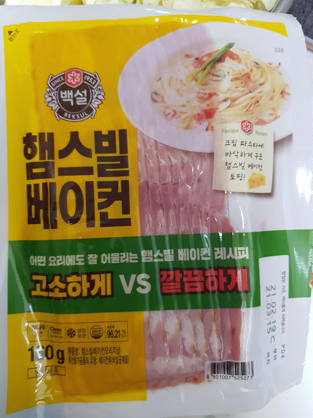 지난번 CJ더마켓에서 160g X 2개짜리 햄스빌 베이컨을 샀습니다. 그중 1팩은 베이컨 볶음밥을 하고 남은 한팩으로 무슨 요리를 할까 냉장고를 열어봅니다.
