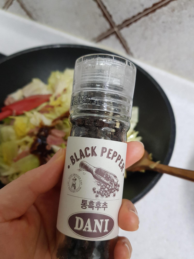4. 숨이 살짝 사그라들면 굴소스 1큰술을 넣고 통 흑후추 여러 번 갈아 넣습니다.