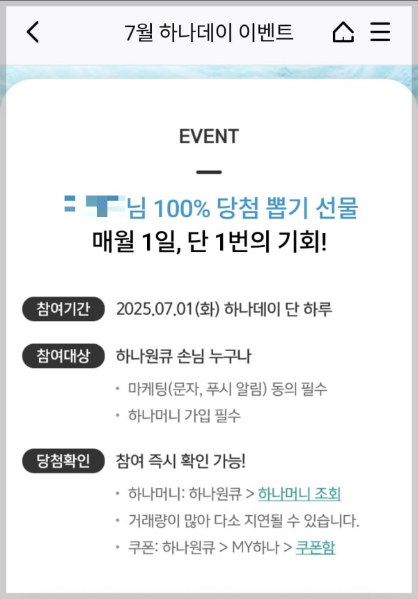 오늘은 25년 7월 1일, 오늘도 1일 앱테크. 매월 1일은 하나데이기 때문에 하나은행 하나원큐앱에 들어간다. 하나머니 앱이 아니라 하나원큐앱이란 거 잊지 말자!