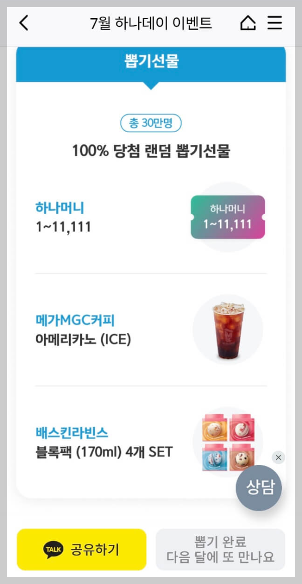 매월 1일은 하나데이다. 하나은행 하나(1Q)원큐 앱에 들어가서 이벤트를 살펴보니 '바캉스 하나뎅 100% 당첨 하나머니, 커피, 배스킨라빈스' 배너가 보인다.