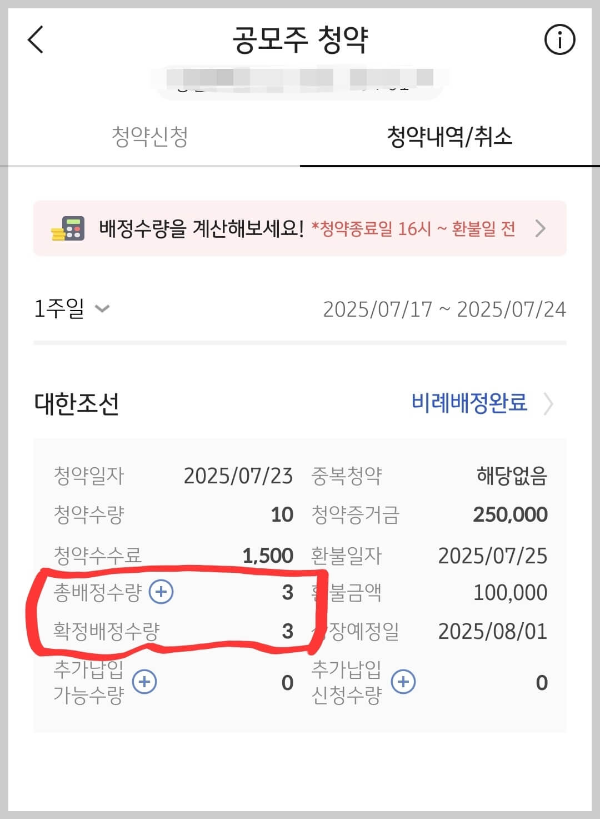 64% 확률 추첨운이 있어 신랑은 대한조선 공모주 총 3주 배정받았다.