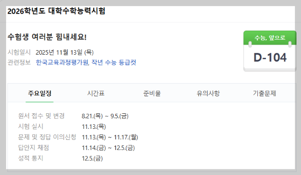 오늘은 수능 D-104. 2026 수능 100일은 바로 다음주 8월 5일(D-100) 화요일이다.