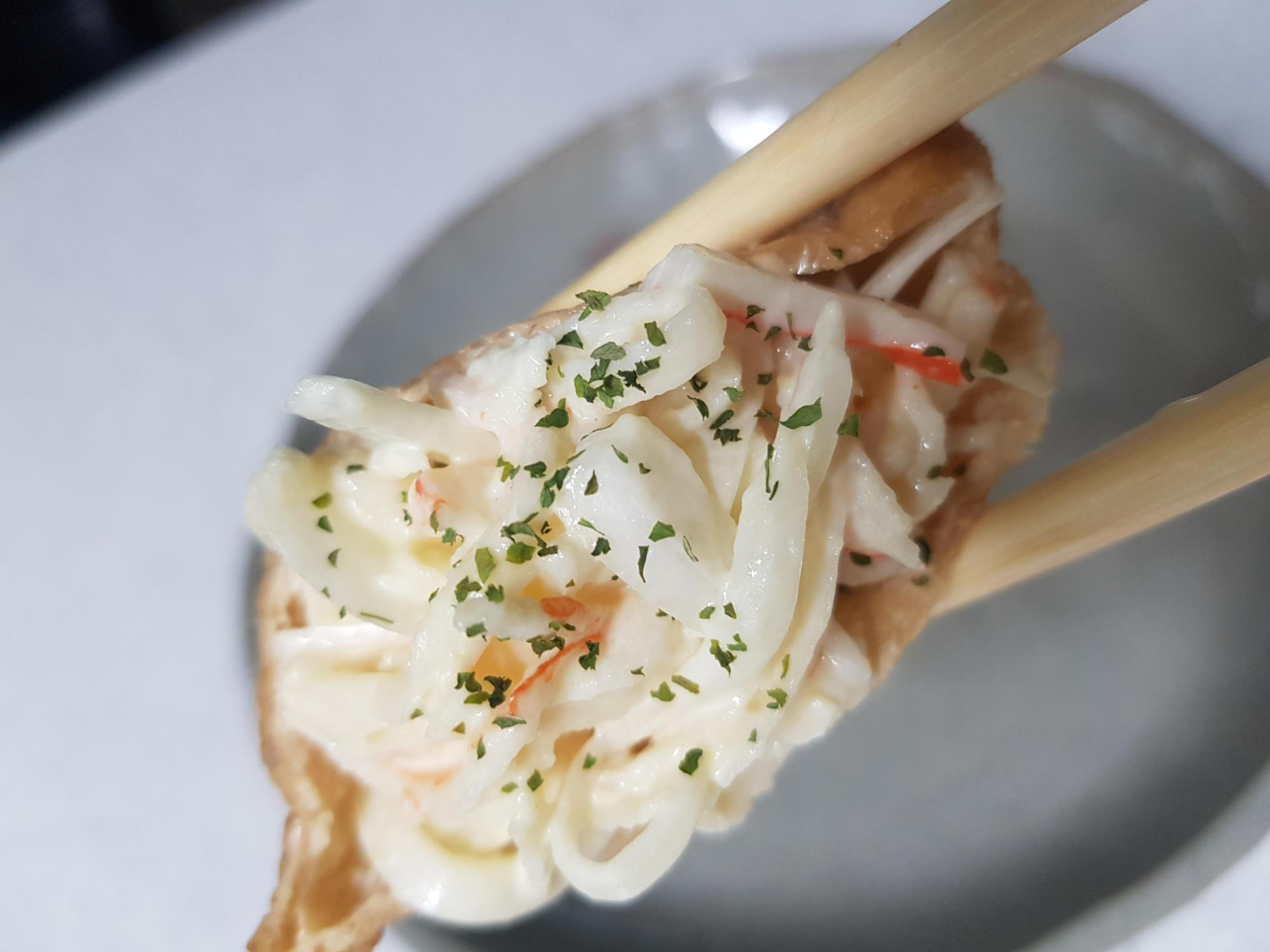 5. 맛살 버무린 것을 올릴 것이기에 유부에 밥을 반 정도만 넣고 마요네즈 소스에 버무린 맛살과 양파를 올려서 완성합니다.