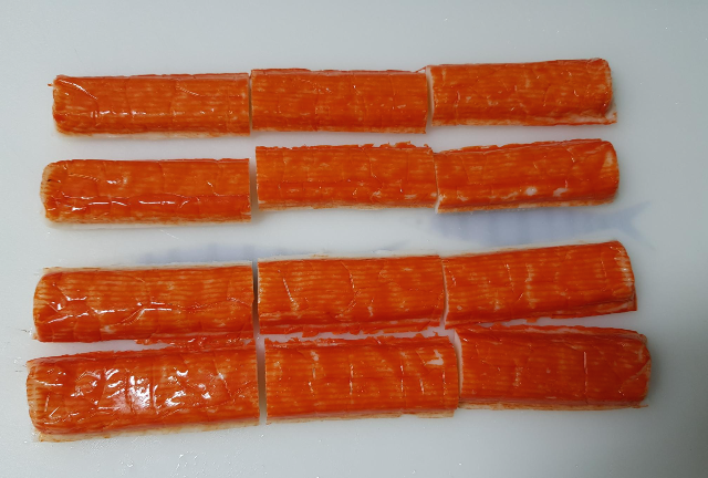 2. 맛살 4줄을 잘게 찢어 줍니다. 만들어보니 살짝 남아서 전 샐러드처럼 먹었어요. 그러니 3줄만 하셔도 될 것 같아요.