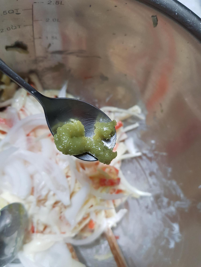 마요네즈를 많이 넣으면 느끼할 수 있으니 적당히 넣어주세요. 또한 식초와 생와사비를 넣으면 덜 느끼하고 맛있는 와사비마요가 되기 때문에 조금 넣어봅니다.