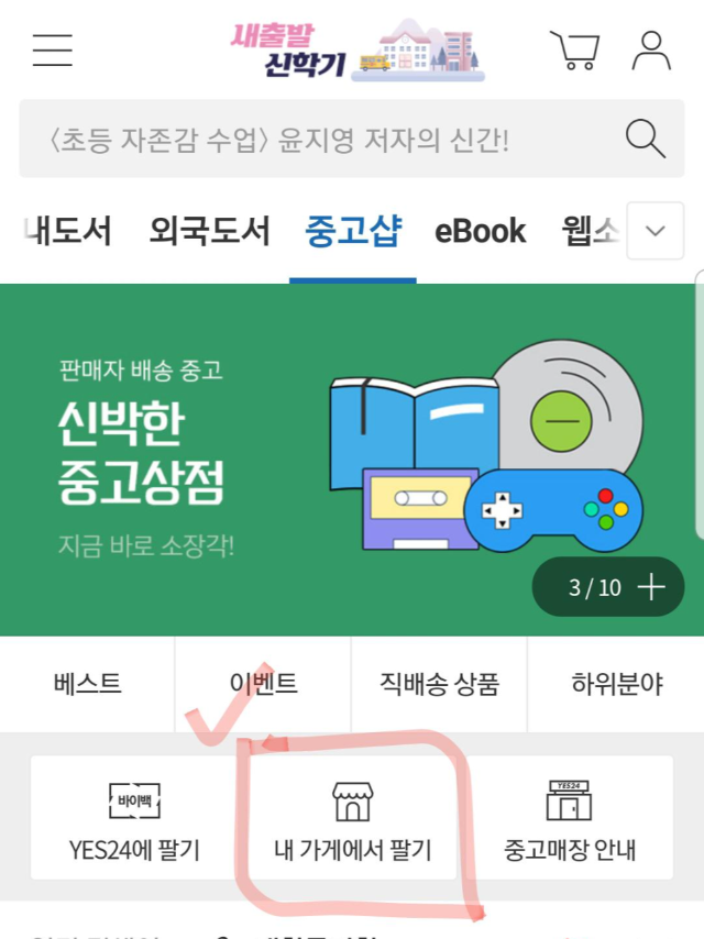 중고샵 클릭하면 내 가게에서 팔기가 보입니다. 옆에 YES24에 팔기도 보이네요.