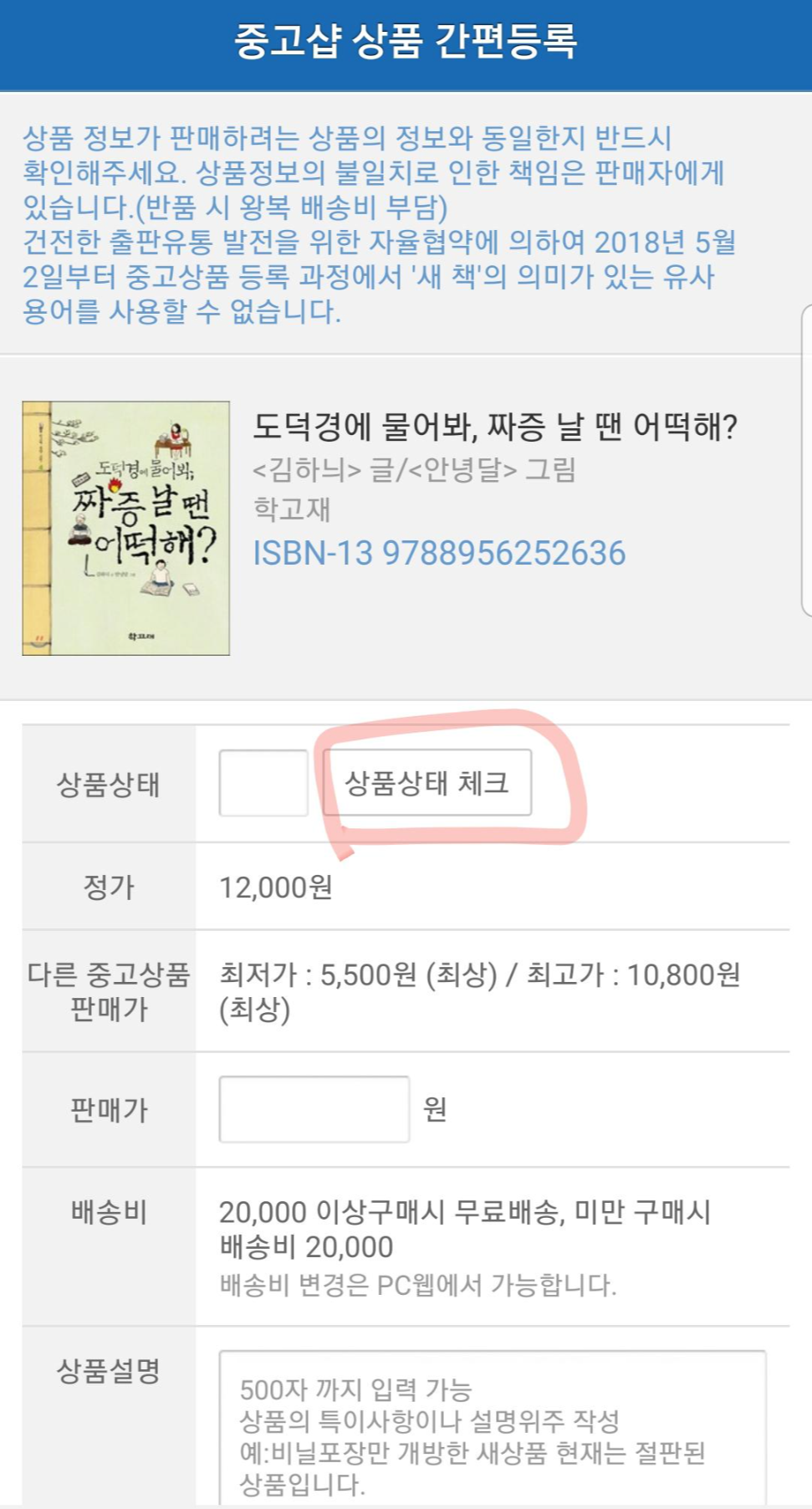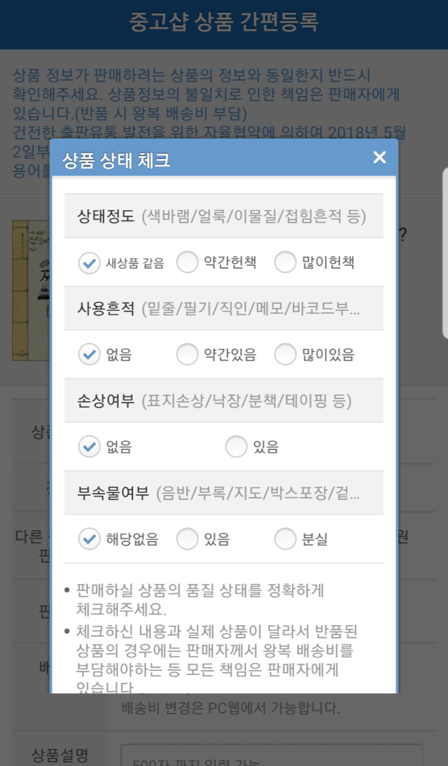 중고샵 상품 간편등록 화면입니다. 내가 판매할 책 상품상태를 체크합니다. 오른쪽 그림과 같은 팝업창이 뜹니다.
