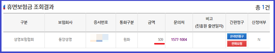 휴면보험금도 하나 있네요. 금액은 509원이네요. 소소하네요 ㅋㅋ