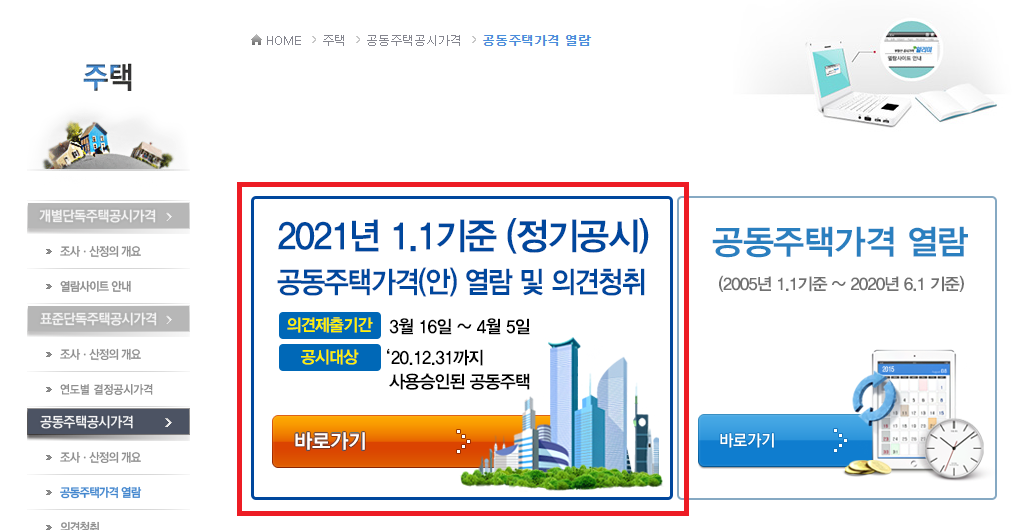 커다란 글씨로 2021년 1.1 기준(정기공시) 공동주택 가격 열람 및 의견청취라고 문구가 보입니다. 그곳을 클릭합니다.