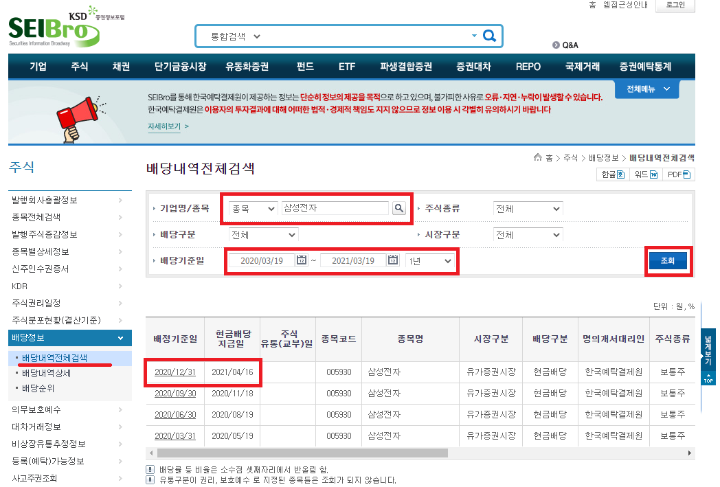 배당지급일 및 배당금 등 배당내역 확인은 Seibro(세이브로)!