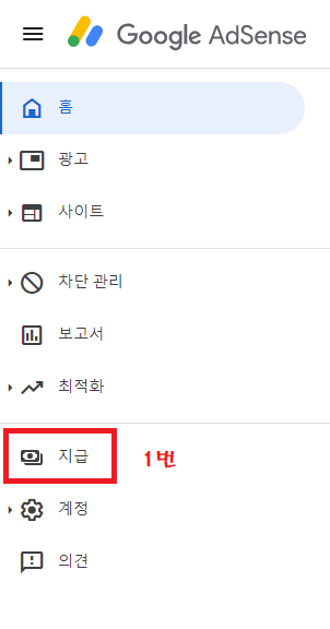 구글 애드센스 웹사이트에서 좌측 메뉴 지급 메뉴를 클릭합니다.(위 수익 지급 기준액 늘리는 곳과 같은 화면임)