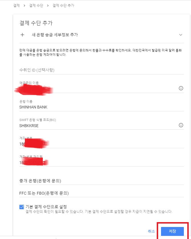 수취인 ID는 선택사항이라 입력하지 않고 예금주의 이름부터 순차적으로 입력했습니다.