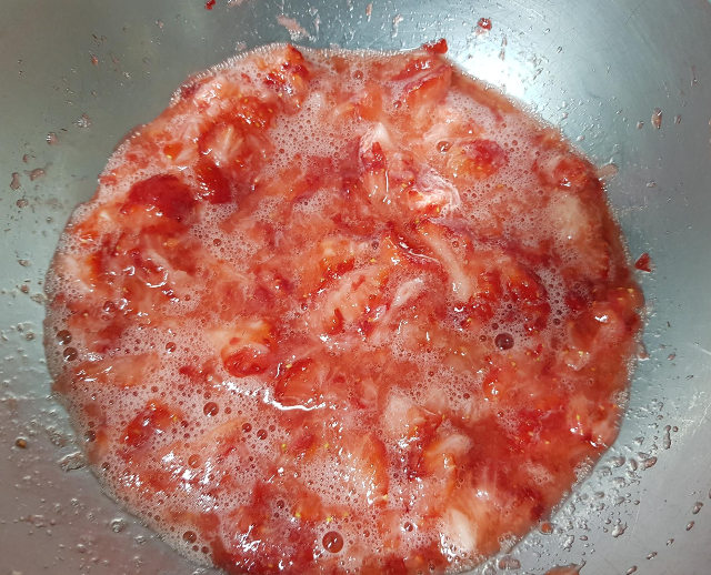 이렇게 으깬 딸기와 설탕을 골고루 섞어서 설탕을 잘 녹여줍니다.