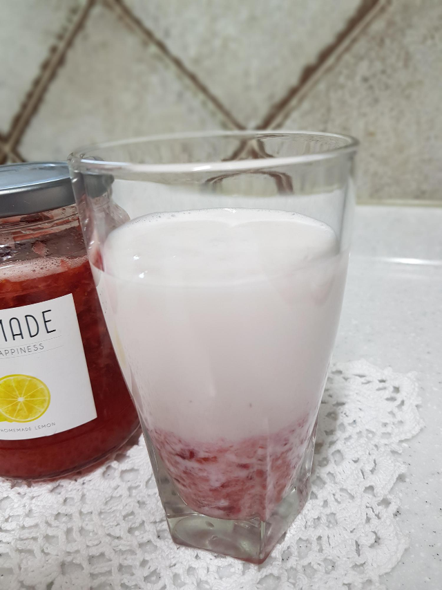 유리컵에 딸기청 3숟가락을 넣어요. 사실 맛을 보니 2숟가락만 넣어도 충분할 듯합니다. 엄청 달더라구요 ㅋㅋ