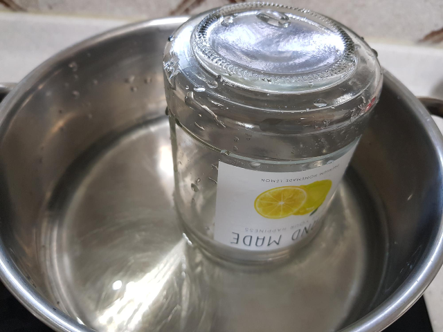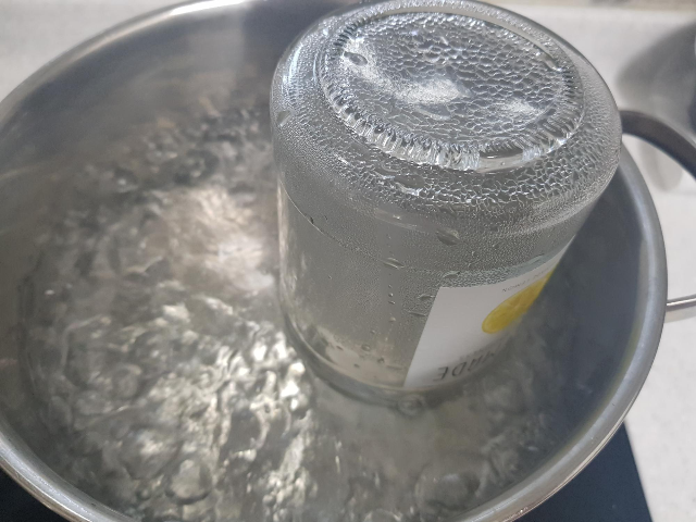 팔팔 끓고 나면 유리병을 꺼내 입구가 위로 향하게 바로 세워주세요.