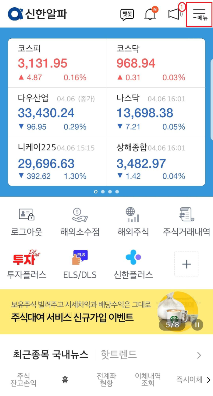 먼저 신한 알파 앱에 들어갑니다. 우측 상단 ①메뉴를 클릭해주세요.