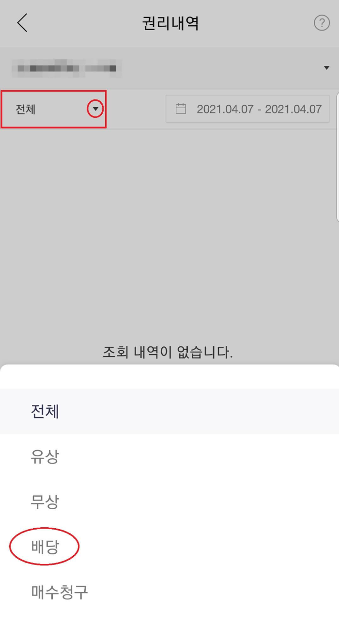지금은 ④권리내역에 들어가 배당금 정보만 확인해보겠습니다. ④권리내역에 들어가면 기간이 당일로 세팅이 되어 있어서 아무것도 조회되지 않습니다.