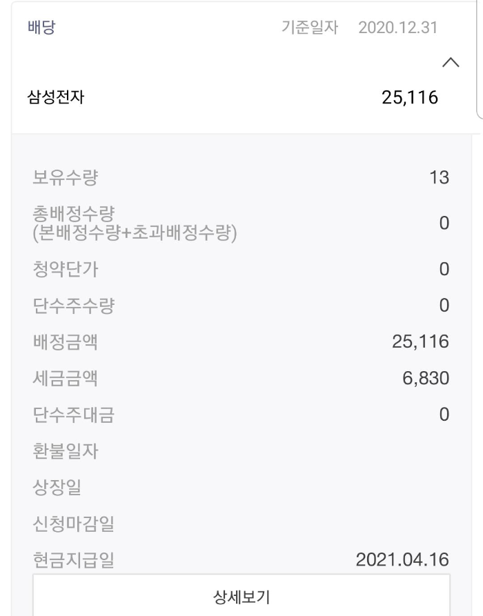 V표시를 누르면 아래와 같이 자세한 정보를 확인 하실 수 있습니다. 20년 4분기 삼성전자 배당금 현금지급일은 2021년 4월 16일이네요.
