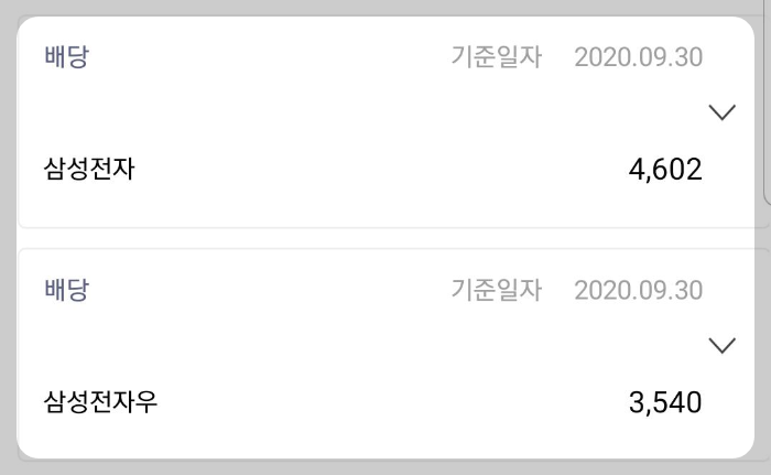6월, 9월에는 보통주, 우선주 1주에 354원씩 배당이 주어져서 삼성전자 보통주 4,602원 , 우선주는 3,540원 배당금을 받았습니다.