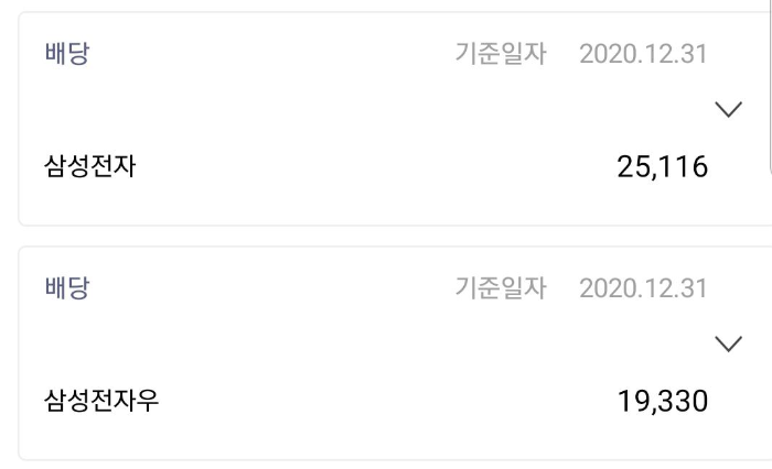 2020년 4분기 삼성전자 배당금은 특별배당을 포함하여 보통주 1,932원, 우선주 1,933원이기에 금액이 더 큽니다.(현재 한투 계좌에 보통주는 13주, 우선주는 10주 보유 중)