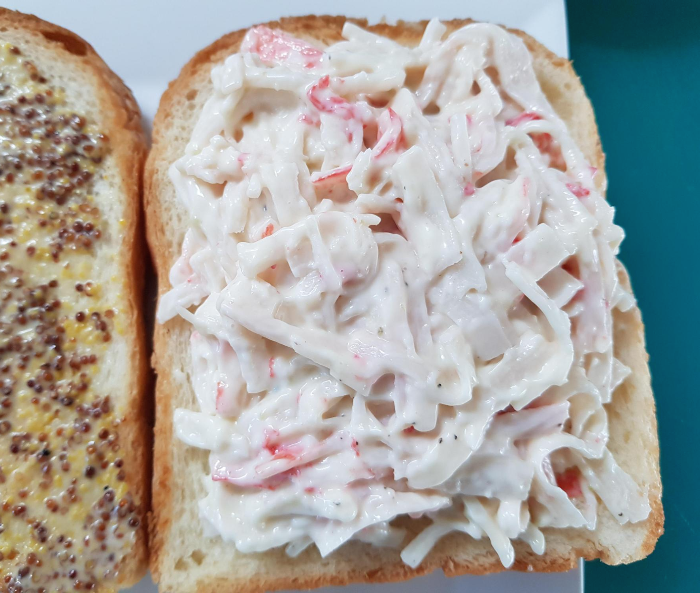 나머지 빵 한쪽에 마요네즈 버무린 게살을 전부 올려줍니다. 풍성하게 먹어봅니다.