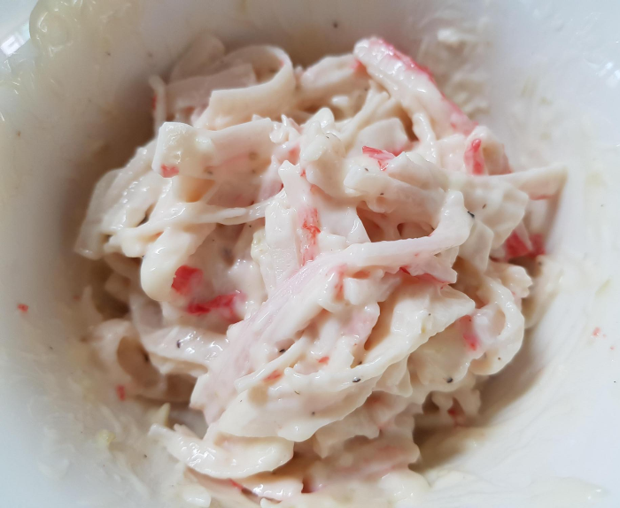 마요네즈 3큰술, 꿀 1작은술, 생와사비 약간, 후추 약간 넣고 잘 섞어서 게살과 버무려주세요.