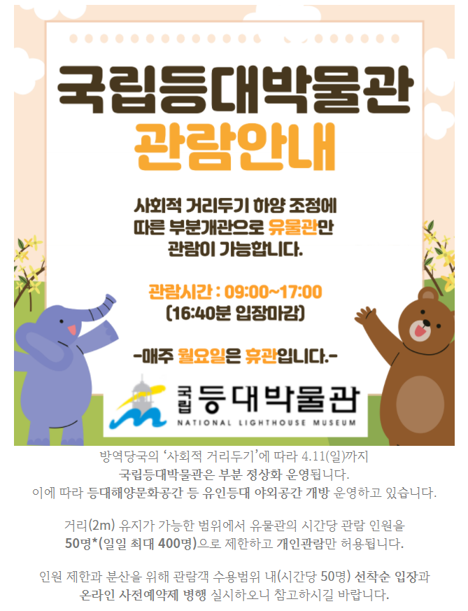 현재 국립 등대박물관은 코로나로 인한 사회적 거리두기로 부분 개관이 이루어지고 있다고 합니다. 방문하실 분들은 참고하시길 바라며 관람안내 올려봅니다.