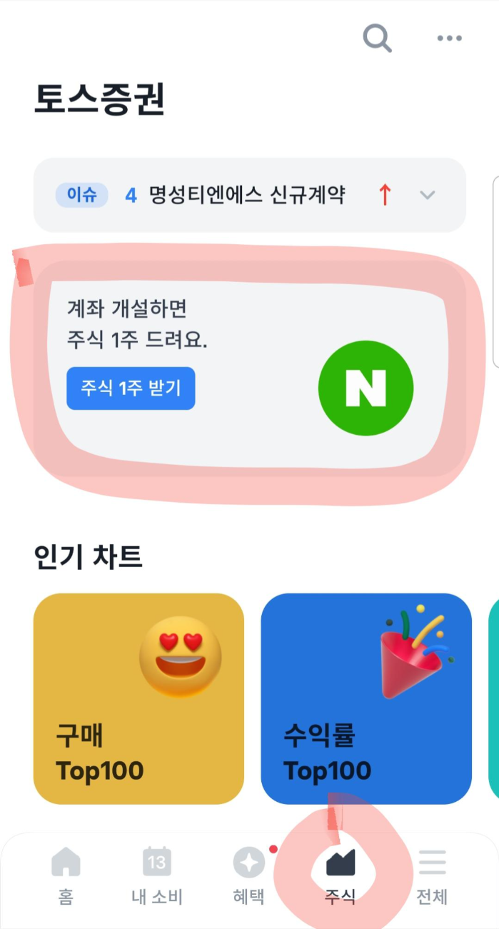 먼저 토스 앱에 들어갑니다. 토스 앱 하단 메뉴 중 주식을 눌러주세요. 토스증권 주식 1주 받기를 클릭하세요.