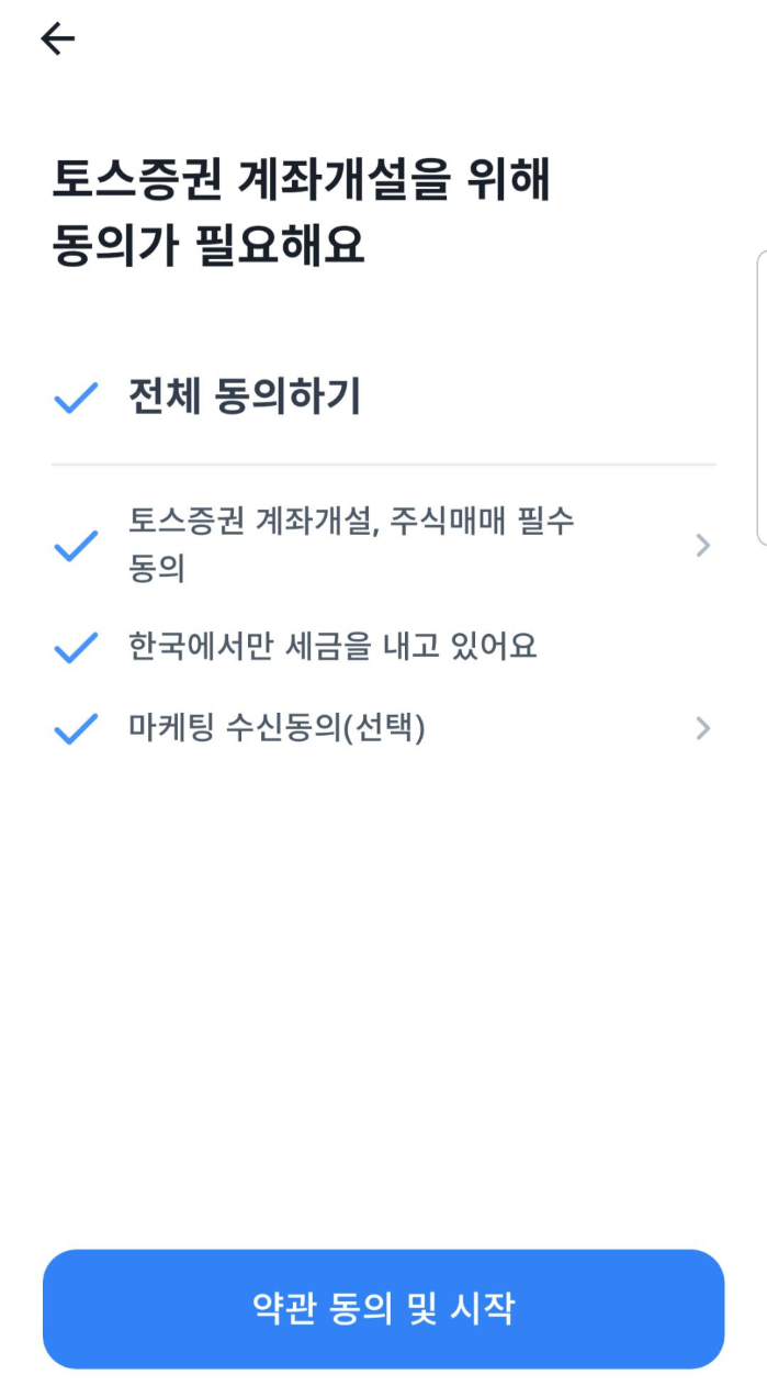 토스증권 계좌개설을 위해 약관 동의를 하고 신분증 촬영을 해야 합니다.