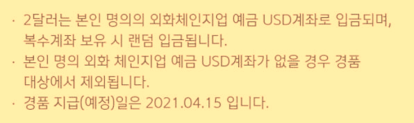 이벤트 기간 동안 썸데이 외화적금 생애 최초 신규 고객 선착순 5천 명에게 2달러 지급한다는 내용이었어요.