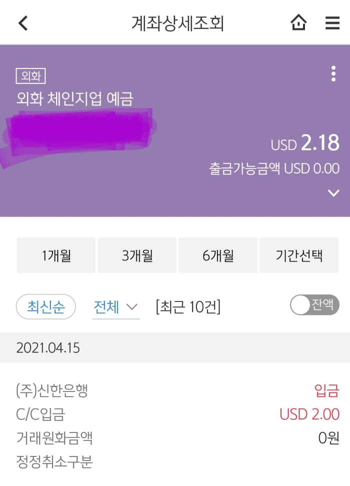 방금 계좌를 살펴봤더니 4월 15일 (주)신한은행에서 2달러를 친절하게 입금해줬네요.