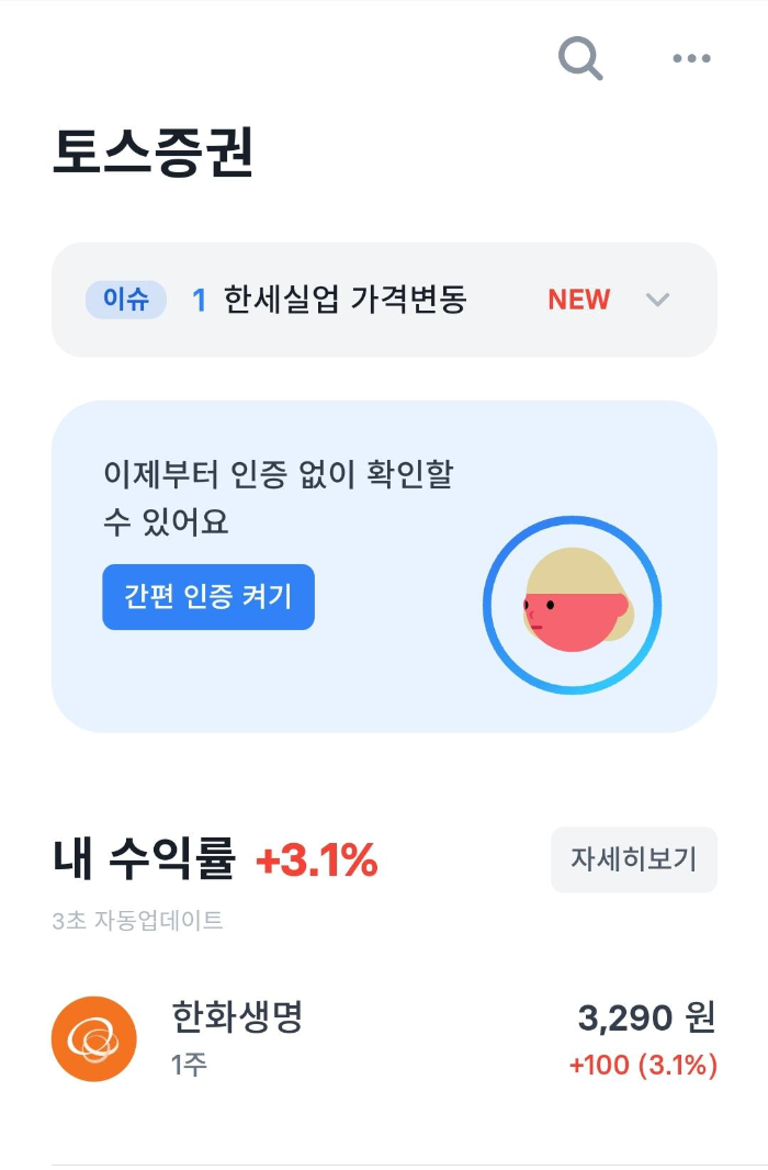 폰을 바꾸니 이래저래 세팅할게 많아서 토스는 좀 전에 들어가 봤어요. 들어갔더니 어머나 이벤트로 받았던 한화생명 1주가 3.1% 수익률을 보여서 너무 반갑네요.