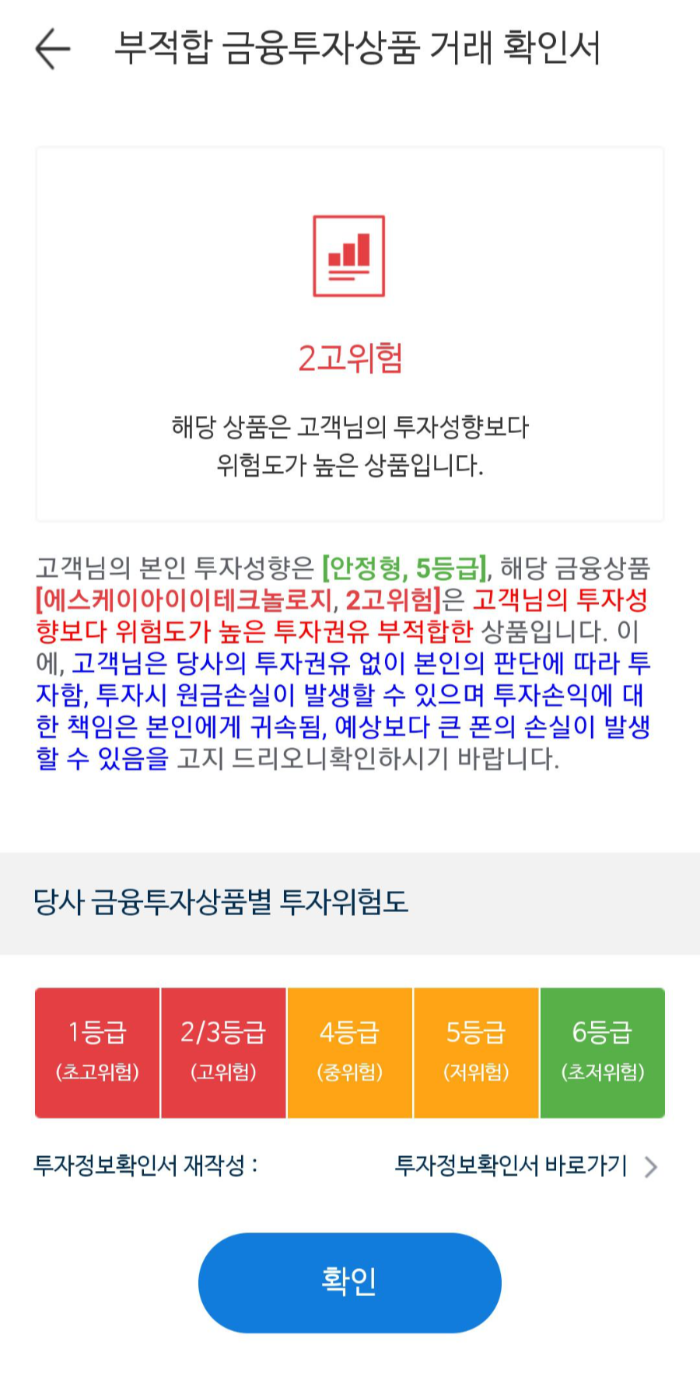 제 투자성향이 5등급 안정형으로 되어있었나 봅니다. 이 화면을 보고 순간 멈칫했습니다. 공모주 청약이 고위험군이구나 하구요. 초보 주린이 소심해요 ㅋㅋ