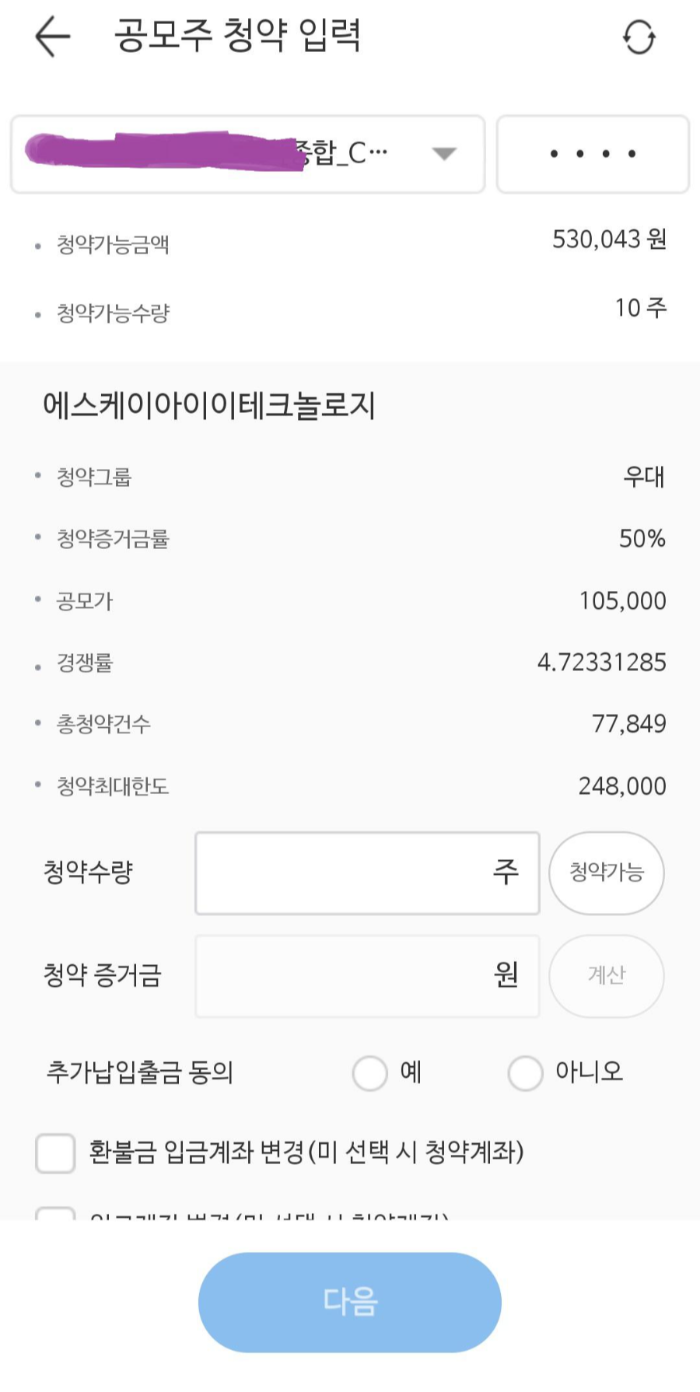 청약수량을 입력하고 계산을 눌러 청약 증거금이 입력되면 하단의 다음이 활성화가 됩니다.