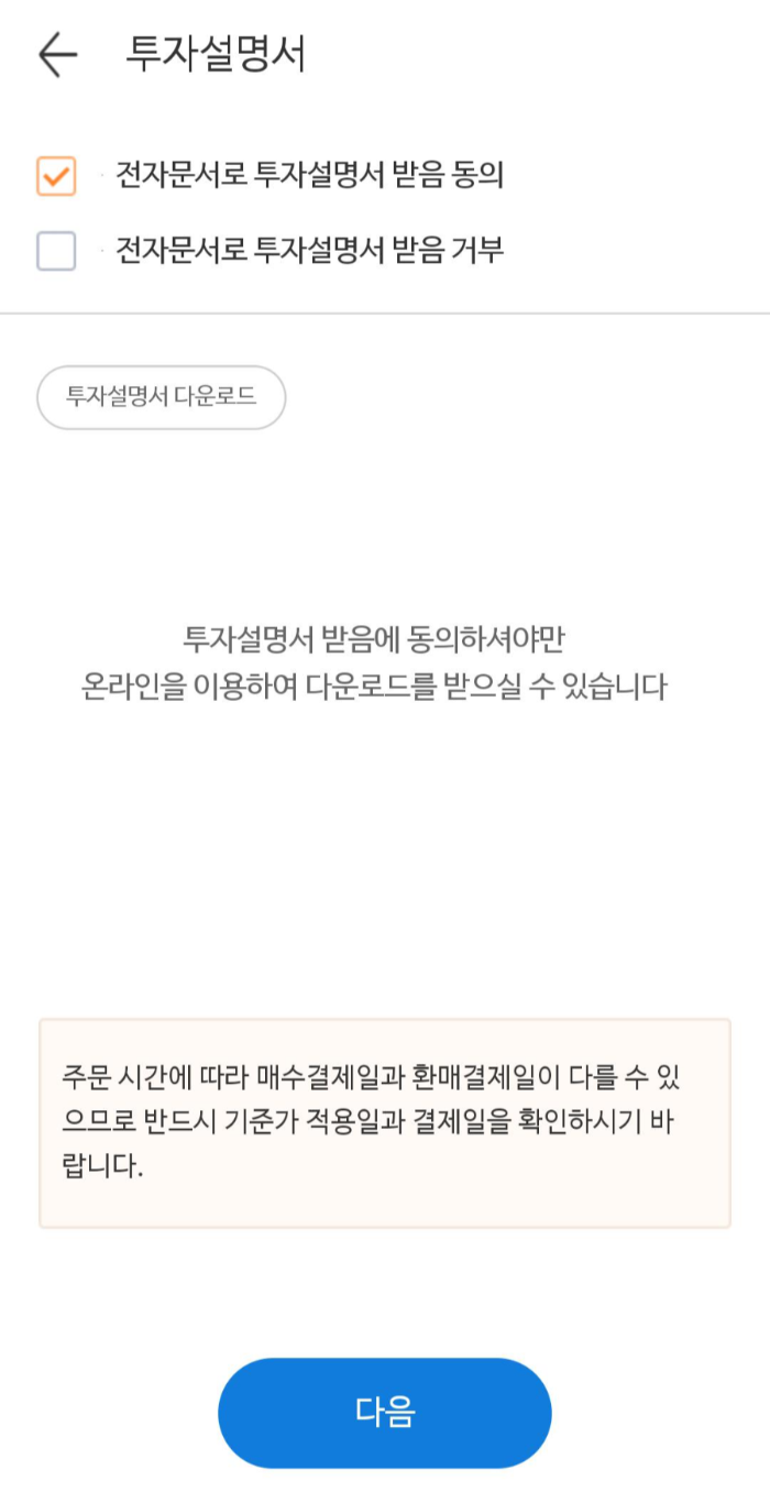전자문서로 투자설명서 받음 동의를 선택하면 내 폰으로 투자설명서가 다운로드됩니다.