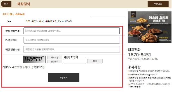 매장을 선택한 후 받을 전화번호, E-쿠폰번호, 매장 전달사항을 적은 후 확인번호 6자리 입력 확인 후 개인정보 수집 약관 동의 체크하고 주문하기 눌러주세요.