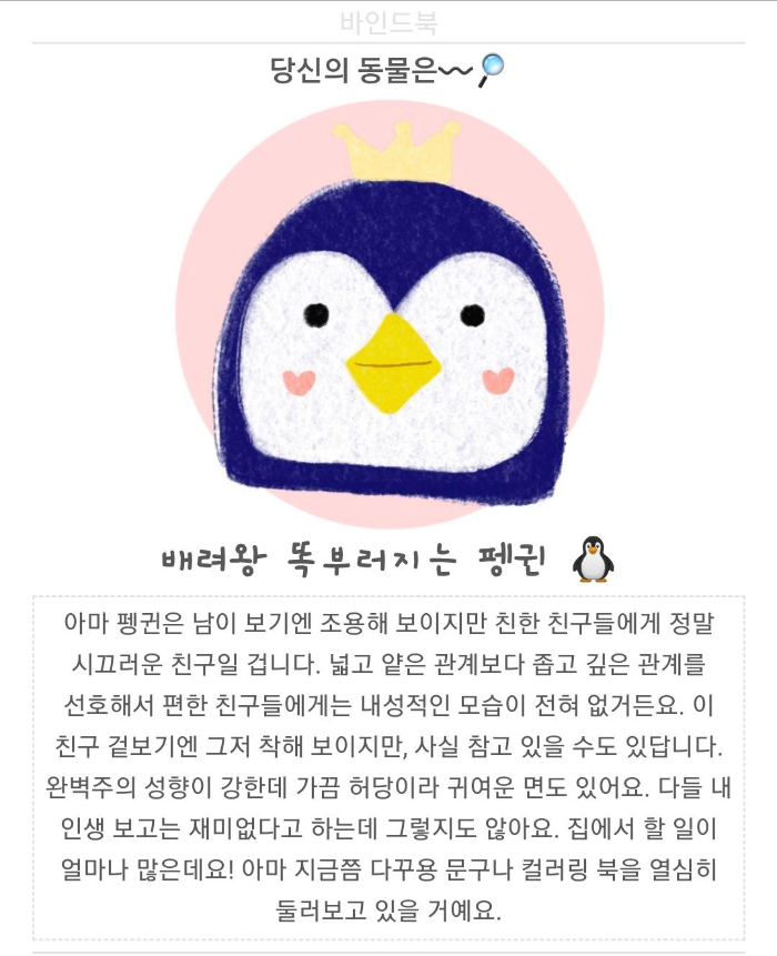 배려왕 똑 부러지는 펭귄 ISFJ형이 나왔어요. 이쯤 되면 저의 MBTI는 ISFJ로 굳혀져 가는 것 같아요 ㅋㅋㅋ