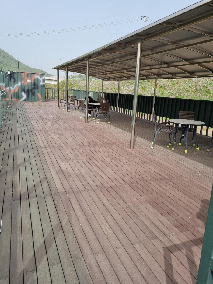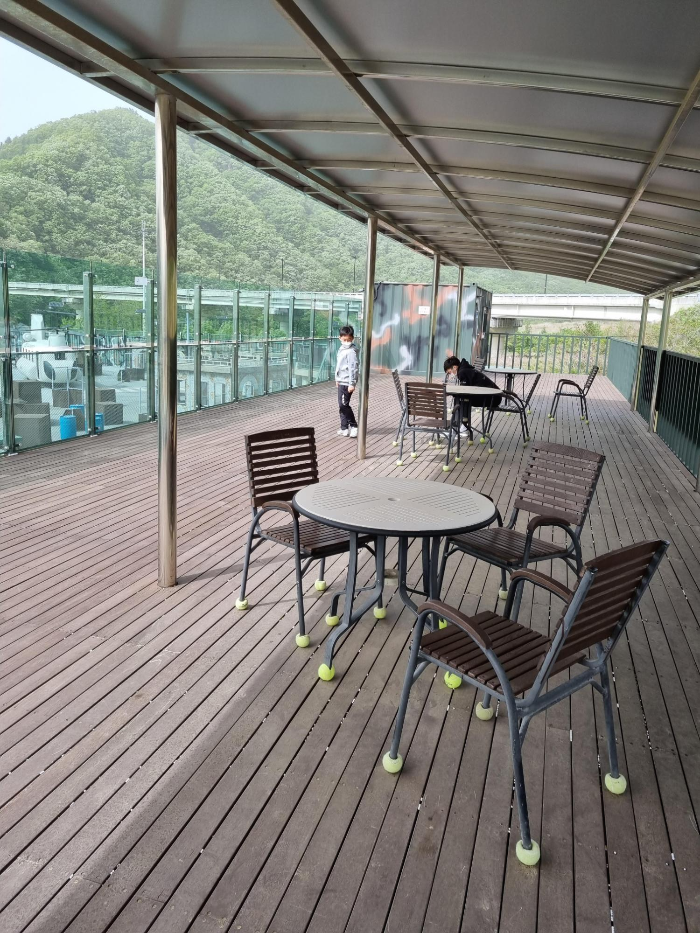 2층 관람석으로 올라가 보니 체험하는 모습을 편히 볼 수 있는 넓은 공간이 마련되어 있었어요. 또한 비비탄 총알이 관람석 쪽으로 튀어 오는 걸 방지하기 위해 서바이벌 체험장 쪽은 유리막으로 되어 있어요.