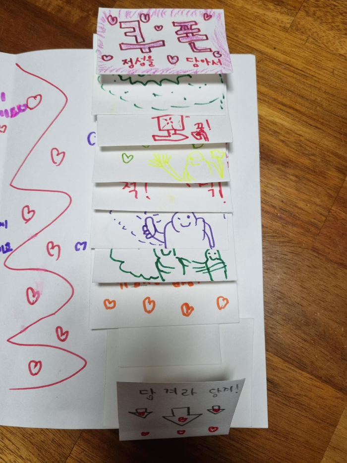 잠시 휴식을 취하고 있는데 둘째가 준비한 게 있다며 살포시 내민다. 어머나 온라인 수업시간에 만든 어버이날 쿠폰북이란다.
